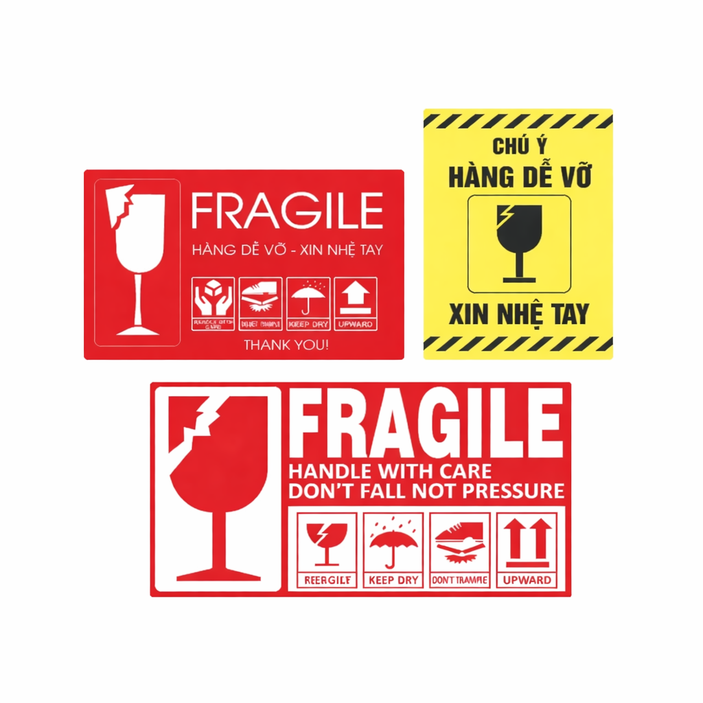 Vấn đề vận chuyển hàng hóa dễ vỡ trong quá trình vận chuyển không phải việc đơn giản nhất là với các hàng hóa làm từ các chất liệu dễ vỡ như thủy tinh, pha lê, gốm hay kính, và nhiều sản phẩm khác… cho nên bạn cần chú trọng đến khâu đóng gói ban đầu đảm bảo. Ngoài ra thì bạn cần phải chuẩn bị các loại tem nhãn hàng dễ vỡ xin nhẹ tay cùng các nhãn báo khác như hướng nâng và đặt thùng, cách vận chuyển,... để đóng gói kiện hàng.
